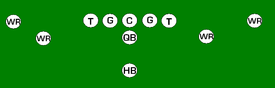 One variation of the T Formation would be where all the running backs would be closer than usual, being at fullback depth rather than halfback depth. Another variation of the "balanced T" formation is the so-called "unbalanced T" formation.[2] In this configuration the line of scrimmage has an end and tackle left of center, while to the right of the center are two guards a tackle and an end. This creates a line that is weighted toward the right of the center. With the backfield lining up in the conventional T formation behind the center (quarterback, two halfbacks and fullback), the resulting configuration is "unbalanced" due the asymmetry of the placement of the linemen. The "split T" spreads the offensive line out over almost twice as much ground compared to the conventional T formation. This causes the defensive line to also spread out, creating gaps the offense can exploit.[3]