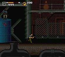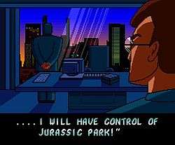 Additionally, the game features a stage in which Grant must flee a Tyrannosarus rex.[3][5] Obstacles such as fire and spikes must also be avoided.[3][5] First-aid kits can be collected to replenish the player's health, while identification cards can be collected for bonus points.[5]