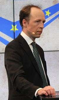 Jussi Kristian Halla-aho (born 27 April 1971 in Tampere[4]) is a Finnish Slavic linguist, blogger and a politician for the Finns Party who has become well known for his essays criticising the humanitarian immigration and multiculturalism policies adopted in Finland.[5][6][7] Halla-aho was first elected to the Helsinki City Council in 2008 and to the Finnish parliament in 2011. In 2014 he was elected to the European Parliament.