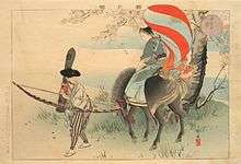 Tsukioka Kōgyo (月岡 耕漁), sometimes called Sakamaki Kōgyo (坂巻 耕漁), (April 18, 1869 – February 25, 1927) was a Japanese artist of the Meiji period. He was a student and adopted son of Tsukioka Yoshitoshi, and also studied with Ogata Gekkō. Although Kōgyo sometimes painted other subjects, for most of his career he made pictures of Japanese noh theatre, either as large-scale paintings or colored woodblock prints. Many of the latter were published in series and sold as multi-volume sets. Some sets, such as Nōgaku zue, have been preserved as albums in their original bindings, including accordion-style bindings known as orihon, while other sets such as Nōga taikan, were issued in sewn bindings known as yamato toji. Although most bound sets belong to institutional collections, individual prints by Kōgyo can still be found through dealers specializing in Japanese prints.