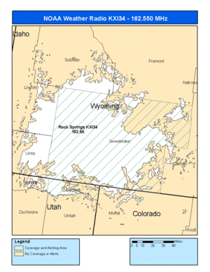 KXI34 is a NOAA Weather Radio station that is programmed from the National Weather Service forecast office in Riverton, Wyoming, U.S.A., with its transmitter located on Aspen Mountain south of Rock Springs. KXI34 broadcasts weather information for the cities of Rock Springs and Green River, Wyoming. It also lists wind speeds along Interstate 80, with data from the Wyoming Department of Transportation. Along with mentioning Sweetwater County, KXI34 also fills in coverage for the northern portion of the Uinta Mountains.