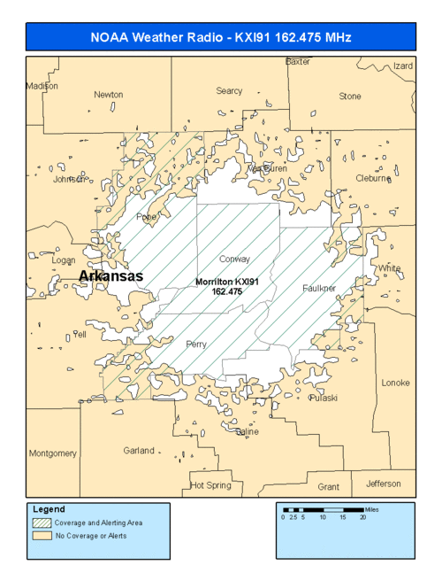 KXI91 (sometimes referred to as Morrilton All Hazards) is a NOAA Weather Radio station that serves the Northwestern portion of the Little Rock-North Little Rock-Conway metropolitan area. It is programmed from the National Weather Service Forecast Office in Little Rock, Arkansas with its transmitter located in Morrilton. It broadcasts weather and hazard information for the following counties: Conway, Faulkner, Perry, and Pope. The four counties that are covered by KXI91 are also covered by WXJ55 out of Little Rock.