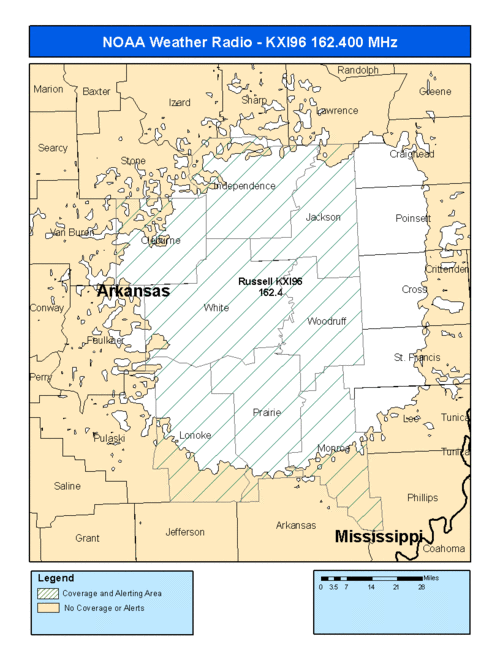 KXI96 (sometimes referred to as Russell All Hazards) is a NOAA Weather Radio station that serves White County and adjacent areas in Arkansas. It is programmed from the National Weather Service Forecast Office in North Little Rock with its transmitter located in Russell. It broadcasts weather and hazard information for the following counties: Cleburne, Independence, Jackson, Lonoke, Monroe, Prairie, White, and Woodruff. Cleburne, Lonoke, Prairie, and White counties are also covered by WXJ55 out of Little Rock.