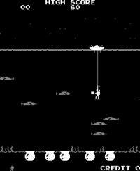 Use the 2-way joystick to direct the boat across the surface of the ocean, then press the button to lower the diver down to the bottom of the ocean while watching out for the sharks swimming across the screen. During this time, you can hold the button to pause the diver's descent and push the joystick in either direction to fire a harpoon at the sharks for 30-300 points apiece. Once the diver has reached the bottom of the ocean, push the joystick in either direction to make him walk towards either of the two treasure caches that are closest to him (the boat will automatically follow his movements at this point). When the diver is directly over a treasure cache, the boat will lower him into it. The amount of points you will receive when you make it back onto the surface of the ocean, which can range from 50-250, will then appear on the screen, and the boat will raise the diver back up to the surface of the ocean. Once again, you can hold the button to pause the diver's ascent, and push the joystick in either direction to fire a harpoon at the sharks. Once you have made it back up to the surface of the ocean, you will have to repeat the entire process for each of the four remaining treasure caches before the game proceeds to the next round.