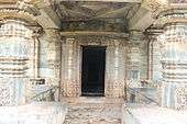 The decorativeness of the outer walls of the main shrine and its closed hall exemplify Chalukyan art. Projections and recesses with niches have been created and used skillfully to accommodate pilasters whose niches contains Hindu deities in relief, depicting the gods Indra, Shiva, his consort Parvati, Lakshmi and others.[1] The doorway to the vestibule has artistic carvings of dvarapalas (door keepers), the goddess of love Rati, and god of love Manmatha. The door lintel (lalata) has an image of Gajalakshmi (Lakshmi flanked by elephants on either side). The eaves over the door has fine images of the Hindu deities Brahma, Keshava (a form of Vishnu) and Shiva.[1] According to Sinha, the exuberance of sculptural articulation seen here is actually a southern Karnataka Hoysala influence on Chalukyan architecture.[3]