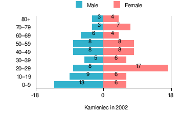 According to the 2002 Poland census, there were 129 people residing in Kamieniec village, of whom 48.8% were male and 51.2% were female. In the village, the population was spread out with 24% under the age of 18, 35.7% from 18 to 44, 21.7% from 45 to 64, and 18.6% who were 65 years of age or older.[1]