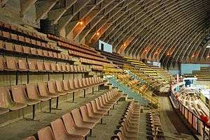 The stadium has an elliptical dome consisting of 120 folded plates (precast) of varying cross-section (average 2m) with the plate thickness of 40mm and series of inter-connected ribs. The lower end of the dome is supported on the elliptical ring beam at 8m level which in-turn is supported on 24 equally spaced arch columns. The top of the dome is supported on elliptical ring of 16m x 8m at 29m level. A small elliptical paraboloid in-situ dome of 4m height and having a series of interconnected stiffeners is resting on the top ring. The folded plate spans about 40m between the two rings. The seating galleries are precast while the other cubicles are in-situ.