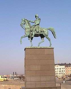 The square is named after the presence of the equestrian statue of King Charles XIV John (1763–1844) today placed just north of the square but originally located south of the canal, and inaugurated on 4 November 1854, the 40th anniversary of the union between Sweden and Norway and four years after the inauguration of the lock of Nils Ericson. Designed by Bengt Erland Fogelberg (1786−1854), at the time located in Italy, the sculpture was cut in Rome and cast in Munich in 1852, while the tall base was cut in Carrara to the design of the artist. The original intentions of the sculptor was to have the statue facing east, the king's command baton pointing out the obvious enemy on the opposite side of the Baltic. When inaugurated, however, the statue was instead turned north towards the city, thus symbolizing the French general and the Bernadotte Dynasty which came with him, arriving to Stockholm to occupy the Swedish throne.[1]