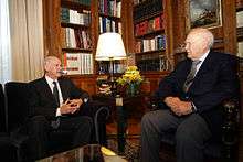 Karolos Papoulias (Greek: Κάρολος Παπούλιας [ˈkarolos paˈpuʎas]; born 4 June 1929) was the President of Greece from 2005 to 2015. He was previously the Minister for Foreign Affairs from 1985 to 1989 and from 1993 to 1996.