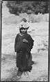 Rumbur Valley, Chitral, NWFP, Pakistan Kalash girl in Rumbur. The girl is dressed in a dark gown and carries jewellery: a ring, a necklace and a headdress (kupa) covered with shells (kauri or cowri). On top of the headdress there is a tassle (probably red) and a second one, smaller, is visible above her forehead. Her shoes are also clearly visible. 1929 approx.