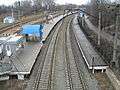Modern on-bridge terminal building at the Karavayevi Dachi Halt (shared with suburban services).- Northwest-bound passenger platforms at Kyiv-Volynskyi Station with urban service ticket box and turnstiless.