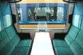 Seating in cars 1, 2, 5, and 6 is arranged 2+1 abreast, with a seat pitch of 1,250 mm (49 in).[5] The seats are covered in cream-coloured leather and feature individual controls for lumbar support and an inflate/deflate feature to help customers relax.[6] Car 3 features cafeteria seating on two levels (6 seats on the lower level and 13 on the upper level).[5] The upper level of the car features a wave-pattern counter along one side of the car. A spacious wheelchair-accessible toilet features a changing board for passengers to stand on to change clothes. The car also features a powder room for female passengers.[6] Car 4 features 4-person Japanese and western-style compartments and 6-person semi-open compartments.[5]