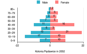 According to the 2002 Poland census, there were 143 people residing in Kolonia Pęcławice village, of whom 46.9% were male and 53.1% were female. In the village, the population was spread out with 26.6% under the age of 18, 41.3% from 18 to 44, 21.7% from 45 to 64, and 10.5% who were 65 years of age or older.[1]