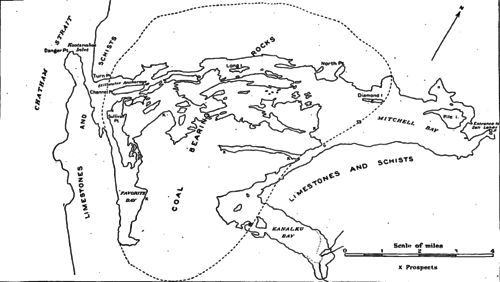 Coal bearing rocks of tertiary age (Eocene and younger) are noted at the inlet in a continuous sequence, The young flora found also point to the Oligocene age overlain by the Miocene age sedimentary rock. Volcanic rocks are noted in the area as seen from the sediment deposits at the inlet.[3] The geological formation of conglomerate, sandstone, siltstone, shale and coal in and around the inlet extending to a thickness varying from 2000–5000 ft are named as Kootznahoo Formation.[4]