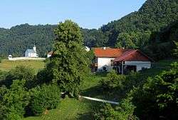 The local church, dedicated to the Holy Cross, was first mentioned in written sources in 1526. The very first church in the village stood at a somewhat lower location, next to the Vodnik house.[7] The current church was restored after being damaged in a fire in 1944. There is a small cemetery behind the church. The cemetery was established by the priest Anton Komlanec (1884–1966) after he was assigned to the parish. Previously the villagers had used the cemetery in Moravče, an hour and a half away.[8]