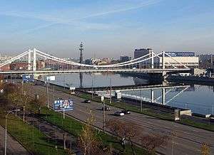Coordinates: 55°44′02″N 37°35′56″E / 55.73389°N 37.59889°E Krymsky Bridge or Crimean Bridge[1] (Russian: Крымский мост) is a steel suspension bridge in Moscow. The bridge spans the Moskva River 1,800 metres south-west from the Kremlin and carries the Garden Ring across the river. The bridge links the Crimean Square to the north with Krymsky Val street to the south. The nearby Moscow Metro stations are Park Kultury and Oktyabrskaya.