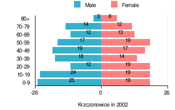 According to the 2002 Poland census, there were 282 people residing in Krzczonowice village, of whom 51.1% were male and 48.9% were female. In the village, the population was spread out with 26.2% under the age of 18, 33.3% from 18 to 44, 20.9% from 45 to 64, and 19.5% who were 65 years of age or older.[1]