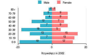 (by age group in 2002)TOTAL 0-9 10-19 20-29 30-39 40-49 50-59 60-69 70-79 80 + I. TOTAL person 168 31 20 28 23 16 19 13 14 4 — of which in % 100 18.5 11.9 16.7 13.7 9.5 11.3 7.7 8.3 2.4 1. BY SEX A. Males person 87 19 7 13 18 7 12 4 5 2 — of which in % 51.8 11.3 4.2 7.7 10.7 4.2 7.1 2.4 3 1.2 B. Females person 81 12 13 15 5 9 7 9 9 2 — of which in % 48.2 7.1 7.7 8.9 3 5.4 4.2 5.4 5.4 1.2