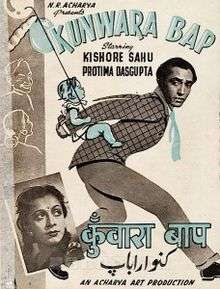 Kunwara Baap (Bachelor Father) is a 1942 Hindi comedy film directed by Kishore Sahu.[1] The film was the debut directorial venture for Sahu, who directed it for the debutant producer N. R. Acharya. Acharya had just started his production company Acharya Arts Productions.[2] The story was written by Kishore Sahu who went on to write and direct films like Kali Ghata, Mayurpankh and others.[3] The music direction was by Ramchandra Pal.[4] The film had Kishore Sahu starring as the bachelor father with co-stars Protima Dasgupta, Anjali Devi, Nana Palsikar, Amritlal Nagar, and Moni Chatterjee.[5]