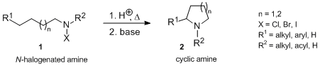 The Hofmann–Löffler reaction (also referred to as Hofmann–Löffler–Freytag reaction, Löffler–Freytag reaction, Löffler–Hofmann reaction, as well as Löffler's method) is an organic reaction in which a cyclic amine 2 (pyrrolidine or, in some cases, piperidine) is generated by thermal or photochemical decomposition of N-halogenated amine 1 in the presence of a strong acid (concentrated sulfuric acid or concentrated CF3CO2H). The Hofmann–Löffler–Freytag reaction proceeds via an intramolecular hydrogen atom transfer to a nitrogen-centered radical and is an example of a remote intramolecular free radical C–H functionalization.[1]