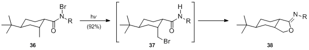 Similarly, S. W. Baldwin and T. J. Doll examined a modification of the Hofmann–Löffler–Freytag reaction during their studies towards the synthesis of the alkaloid gelsemicine 41. The formation of the pyrrolidine ring of 40 was accomplished by irradiation of N-chloroamide 39.[19]