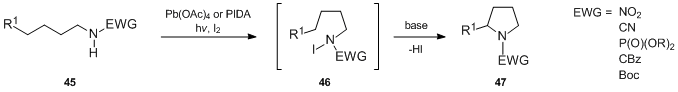 The great advantage of the Suárez modification is that the reaction can be performed under very mild neutral conditions compatible with the stability of the protective groups most frequently used in synthetic organic chemistry. Consequently, it permits the use of the Hofmann–Löffler–Freytag reaction with more sensitive molecules. Other notable features of this methodology are the following: (1) the unstable iodoamide intermediates are generated in situ; (2) the iodoamide homolysis proceeds thermally at low temperature (20–40 °C) or by irradiation with visible light, which obviates the need for a UV lamp. The Suárez modification has found numerous applications in synthesis (vide infra).