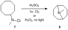 Although the reaction was first reported in 1883, its mechanistic details were not fully understood until the late 1950s. The mechanism of the Hofmann–Löffler–Freytag reaction was first investigated by S. Wawzonek, who studied cyclization reactions of various N-halogenated amines.[11][12][13] In 1949, Wawzonek and Thelan[11] reported that a solution of N-chloro-N-methylcyclooctylamine 7 in sulfuric acid when irradiated with ultraviolet light in the presence of chlorine or when treated with hydrogen peroxide in the dark gave up to 24% yield of N-methylgranatinine 8, much more than is formed in the absence of light and peroxide. Based on this evidence, they correctly proposed that the reaction proceeds via a radical chain reaction pathway. More specifically, Wawzonek and Thelan[11] suggested that the N-chloroamine is first protonated with the acid and then undergoes homolytic cleavage under the influence of heat, light, or other initiators to afford amminium and chloride free radicals. The amminium radical intramolecularly abstracts a sterically favored hydrogen atom to afford an alkyl radical which, in a chain reaction, abstracts chlorine from another N-chloroammonium ion to form an alkyl chloride and a new amminium radical. The alkyl chloride is later cyclized under the influence of alkali and the cyclic tertiary amine results.[14]