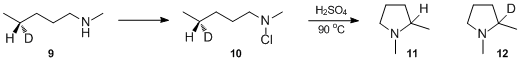 In order to determine, whether the replacement of hydrogen in the cyclization of N-haloamines proceeds with retention, inversion, or equilibration of configuration, deuterated amine 9 was synthesized. Chlorination of 9 followed by thermal decomposition of its N-chloro derivative 10 in sulfuric acid at 90 °C produced optically inactive 1,2-dimethylpyrrolidine. This experimental observation was a strong evidence in favor of intermediacy of a species with an sp2-hybridized δ-carbon.