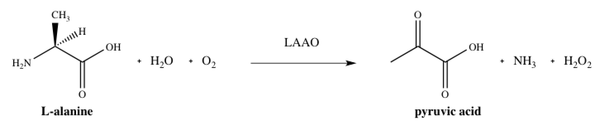 As suggested by the name of the family, LAAOs are flavoenzymes which function to catalyze the stereospecific oxidative deamination of an L-amino acid.[4] The three substrates of the enzymatic reaction are an L-amino acid, water, and oxygen, whereas the three products are the corresponding α-keto acid (2-oxo acid), ammonia, and hydrogen peroxide. One example of the enzyme in action occurs with the conversion L-alanine into pyruvic acid (2-oxopropanoic acid), as shown in Figure 1.