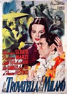 La trovatella di Milano (i.e. "The foundling of Milan") is a 1955 Italian historical melodrama film produced and directed by Giorgio Capitani and starring Massimo Serato and Franca Marzi. Set during the Five Days of Milan, it is loosely based on a novel with the same name written by Carolina Invernizio.[1][2] It grossed 146 million lire at the Italian box office.[1]