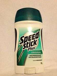 Speed Stick is a brand of deodorant/antiperspirant that, as the name suggests, comes in stick form. The product is owned by its parent company, Colgate-Palmolive. It was formerly known as "Mennen Speed Stick" prior to Colgate-Palmolive's purchase of The Mennen Company. Currently, the products feature the words "by Mennen" in a small font on the label. Speed Stick comes in both deodorant and antiperspirant forms. Speed Stick is both a sponsor and the official antiperspirant of the NHL.