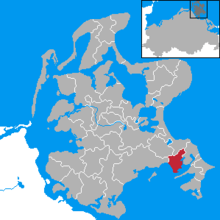 The dolmens are located in the southeastern part of Rügen, Mecklenburg-Vorpommern, south of the federal route B196, just southwest of the village Lancken-Granitz and northwest of the village Burtevitz, both part of the Lancken-Granitz municipality.[1] A group of seven dolmens is lined up northwest of the road between Lancken and Klein Stresow, numbered 1 to 7 from the northeast to the southwest.[1] This numbering follows Schmidt (2001), other publications use different numeration codes. Dolmen Nr. 6 and Nr. 7 belong to the Burtevitz subdistrict, which also contains several megaliths,[2] but are nevertheless included with the Lancken-Granitz Dolmen per Schmidt (2001), as they lie just across the border to the Lancken-Granitz district that runs between dolmen Nr. 5 and Nr. 6.[1]