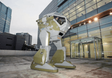 The Land Walker is the first 3.4 meters tall, two-legged exoskeleton robot with a cockpit and two cannons mounted on the arms that for now shoots out rubber balls. It does not actually walk, however, instead shuffling on wheels hidden under its "feet" at approximately 1.5 km/h. This means it is not technically a walker; it merely has the appearance of one. It was invented by Masaaki Nagumo and created by researchers who hope to someday create similar robots to be used in the military and in defense against crimes. But for now it is used as a way to promote the idea of robotic defense.