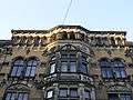 Largely spared by the effects of the war, the building has been restored on several occasions. A plaque on the Ostertorstraße reads: Dies Haus ist gewidmet dem Rechte zum Schutz – dem Boesen zum Trutz (This building is dedicated to upholding the law and to defying evil). The impressive sandstone and bronze decorations of the cornice include lions, the heads of Megaera and Medusa, and dragons spouting rainwater. The massive round towers, the diamond-shaped decorations on the facade, the granite window frames together with the bas-reliefs, the round-arched windows and the combination of styles are all typical of the Wilhelmistic chapter of Historicist architecture. Stained-glass windows depict the Ten Commandments above the entrance and the cardinal virtues in the first floor windows overlooking Violenstraße. The figures of animals and birds decorating the corbels symbolize vice in the struggle for virtue. The Hanseatic Arms are presented in the form of a maiolica crest representing shipping and trade.[2]