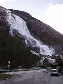 Langfossen is a waterfall located in the municipality of Etne in Hordaland county, Norway. The waterfall is located about 5 kilometres (3.1 mi) southwest of the village of Fjæra. The water falls down a towering mountain, a total distance of about 612 metres (2,008 ft) before the water leaps out into Åkrafjorden at the base of the mountain. European route E134 runs along the base of the waterfall, making access very easy.