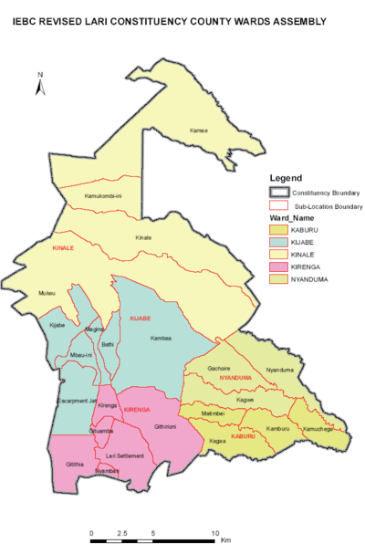 Lari Constituency is an electoral constituency in Kenya, located forty kilometers from Nairobi along the Nairobi-Nakuru highway (A104 road). Lari is located in the Western part of Kiambu County. The constituency was established in 1966. Lari borders Kinangop and Limuru to the north, Githunguri and Gatundu North constituencies to the east and Nyandarua County to the west. Lari is one of the 12 sub-counties in Kiambu County, and is further divided to five wards each electing a representative to the Kiambu County Assembly.
