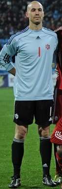 He made his debut for Canada in a January 2000 friendly match against Bermuda but had to compete with Pat Onstad for the national goalkeeper's jersey. By November 2009, he earned a total of 29 caps. He has represented Canada in 6 FIFA World Cup qualification matches.[6] Hirschfeld's big break with Canada came at the 2002 CONCACAF Gold Cup, where he was named the best goalkeeper of the tournament after allowing only four goals in five matches and recording an impressive semifinal shutout against the United States. This caused English club Tottenham Hotspur F.C. to take interest, and Hirschfeld signed with them in September 2002. On 8 June 2012, Hirschfeld was sent off in a 2014 World Cup qualifier against Cuba for handling the ball outside his penalty area, but Canada prevailed by a score of 1:0 despite the numerical disadvantage.