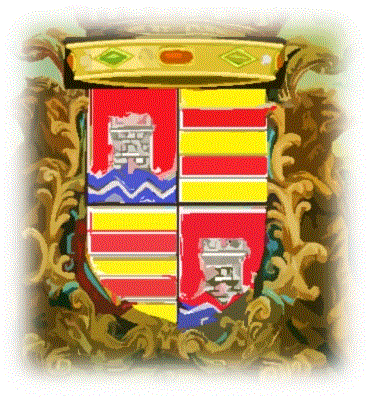 The book "Repertorio de Blasones de la Comunidad Hispánica"[3] give us the description of historical Coat of Arms of Latas Lineage. Quartered shield: 1 and 4 : gules, a tower of silver, waves on water of azure and silver, and 2nd and 3rd : gold, two bands of azure . The Coat of Arms is presided by the lofty status that grants the infanzonía, simbolized as a crown.[4]