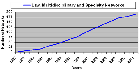 There were two distinct and different reasons for networks developing in the legal profession. The first was internationalization which became globalization in the 1990s. Law firms simply needed international connections.[8] The second was expansion of a number of large United States firms to become “national”. Smaller firms or firms with a niche practice required this same expertise in other states. The networks provided them this expertise.