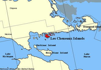 Les Cheneaux Islands (French: "The Channels") are a group of 36 small islands, some inhabited, along 12 miles of Lake Huron shoreline on the southeastern tip of the Upper Peninsula of Michigan in the United States. The name is French for "the Channels", noting the many channels between the islands in the group. They are about 30 miles northeast of Mackinac Island and about 35 miles south of Sault Ste. Marie. The islands are a popular resort and boating and kayaking area. The nearby communities of Hessel and Cedarville on the mainland offer marinas, camping, lodging, restaurants, and shopping. The Les Chenaux Islands Antique Boat Show & Festival of the Arts has been held on the second Saturday of each August since 1976 in Hessel. It is the world's largest antique wooden boat show.