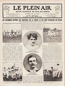 The first rugby competition was held in 1892 as a one-off championship game between two Paris-based teams, the Racing Club de France and Stade Français. In 1900 rugby was played at the Paris Summer Olympics. France won the gold medal of the first ever rugby event at the Olympics. Racing Club made it to the championship final on 31 March 1912. France joined an international competition in 1910, and coined the term Tournoi des Cinq Nations (Five Nations Championship); a term that would last almost the entire century.[13] On 1 January 1913, at the France-Scotland match, spectators threw themselves on the referee to express their dissatisfaction. The mounted police were forced to intervene charging. This violent incident led to the secretary of the Scottish Rugby Union to declare: "If the game can only be played under the protection of the police or the military, it is not worth playing".[14] Following this incidents, Scotland refused to face France at the 1914 tournament.[15] France was implicitly excluded from further tournaments, but World War I did not permit the application of this exclusion.