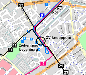 Leyenburg is a RandstadRail station in The Hague, Netherlands. It is a stop for RandstadRail line 4, tram line 6, and bus lines 21, 23, 26, 27, 31, 34, 35, 36, 37 and 86, and is located on the Leyweg. Leyenburg serves as an important interchange between bus and tram services.