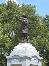- The Farrier Memorial, a 6-foot (1.8 m) bronze statue of a firefighter atop a domed granite base of 15 feet (4.6 m), was a bequest by Police Captain Frederick T. Farrier to honor the Volunteer Fire Department and was dedicated on November 21, 1931.[31]