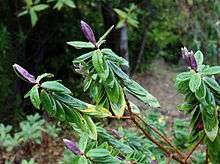 Linum monogynum (common names Rauhuia, Native Linen, New Zealand linen flax) is a short-lived perennial or woody subshrub endemic to North Island, South Island, Stewart Island, and the Chatham Islands of New Zealand. It grows up to 16 inches (40 cm) high, with spear-shaped, leathery-gray to green leaves that are 0.2–1 inches (5–25 mm) long, and white flowers up to 1 inch (2.5 cm) in diameter.