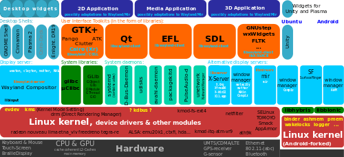 Other components: ALSA, DRI, evdev, LVM, device mapper, Linux Network Scheduler, Netfilter