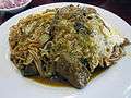 Thick rice noodle salad with chickpea flour, chicken, fish cake (nga hpe), onions, coriander, spring onions, crushed dried chilli, dressed with fried crispy onion oil, fish sauce and lime. | |