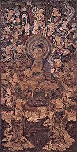 | Amida with Eight Great Bodhisattvas, gold and silver on purple silk 紫絹金銀泥絵阿弥陀八大菩薩像 shiken kingin doro-e Amida hachi-dai bosatsu zō | Goryeo | Tsuruga | Zenmyō-ji (善妙寺) | Goryeo Buddhist painting | | 155 centimetres (61 in) by 146 centimetres (57 in) | 35°39′13″N 136°04′19″E / 35.653631°N 136.071838°E | |