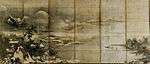 | Landscape of the Four Seasons, ink and light colour on paper, six-panel byōbu 紙本墨画淡彩四季山水図〈/六曲屏風〉 shihon bokuga tansai shiki sansui zu (rokkyoku byōbu) | Muromachi period | Hatsukaichi | Woodone Co Ltd (ウッドワン) (kept at the Woodone Museum of Art (ウッドワン美術館)) | pair of screens; traditionally attributed to Shūbun but likely of a later date | ![]() | 150.4 centimetres (59.2 in) by 347 centimetres (137 in) | 34°29′56″N 132°08′37″E / 34.498781°N 132.143633°E | |