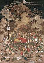 | Nirvana painting, colour on silk, by Mubun 絹本著色涅槃図 無分筆 kenpon chakushoku nehan zu Mubun hitsu | Muromachi period | Nanao | Chōju-ji (長壽寺) (kept at Ishikawa Nanao Art Museum) | | 166.0 centimetres (65.4 in) by 115.0 centimetres (3.773 ft) | 37°02′41″N 136°57′13″E / 37.044811°N 136.953732°E | ||