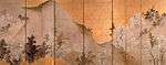 | Spring and Summer Landscapes, colour on gold ground, byōbu attributed to Unkoku Tōgan 金地著色春夏山水図〈(伝雲谷等顔筆)/六曲屏風〉 kinji chakushoku shunka sansui zu (den-Unkoku Tōgan hitsu rokkyoku byōbu) | Momoyama period | private | pair of six-fold screens | | ||||